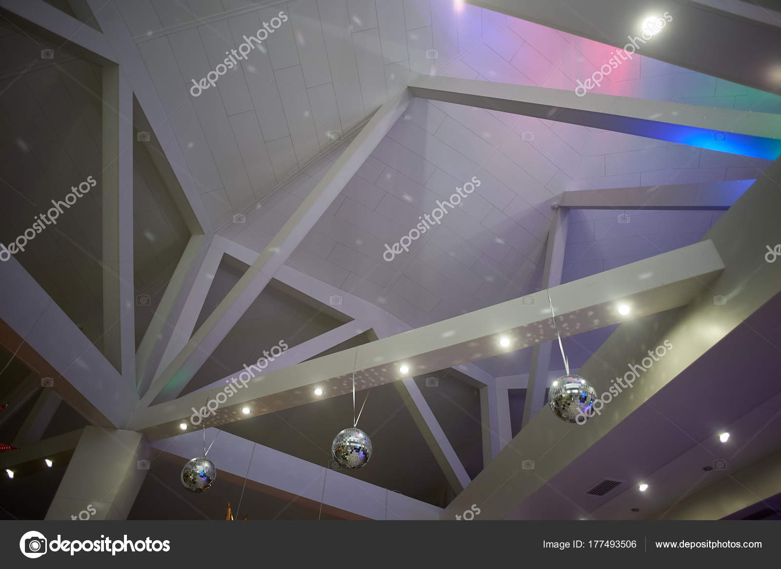 The High White Ceiling With Exposed Beams Decorated With Disco